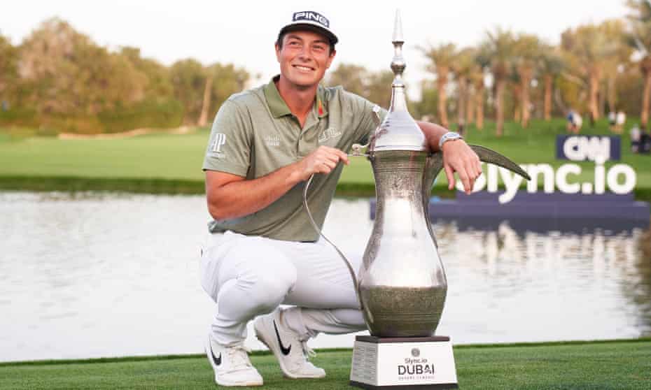 DUBAI AFP - Viktor Hovland made a remarkable final round charge to defeat Richard Bland in the first play-off hole and win the Dubai Desert Classic on Sunday Jan 30. Hovland is using them as well as anyone at the moment coming off victories in his last two starts in Mexico and the Bahamas elevating the former Oklahoma State star to No. Viktor Hovland and Richard Bland went low late on Sunday to set up a thrilling finish to the DP World Tours 2022 Slyncio Dubai Desert Classic.